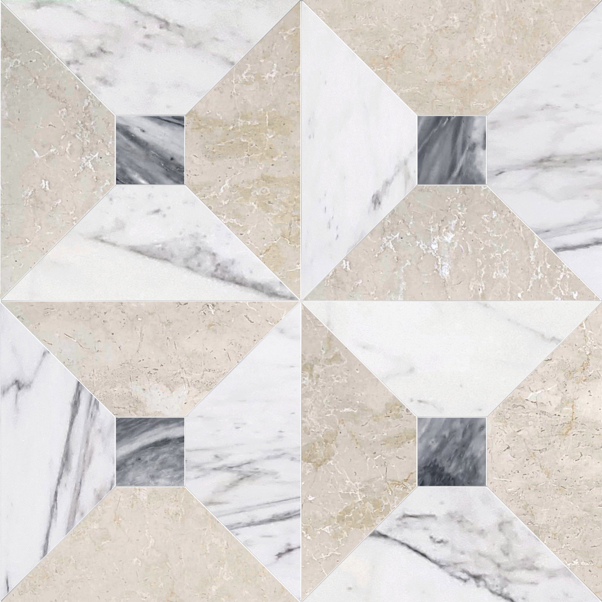 Showcase the timeless beauty of Anabelle Calacatta and Botticino marble, elegantly accented with a Bardiglio dot checker waterjet pattern. This tile brings together sophisticated veining and subtle contrasts, creating a refined design that enhances any space with understated luxury and artistic detail. Ideal for elevating floors and walls with a classic yet contemporary touch.