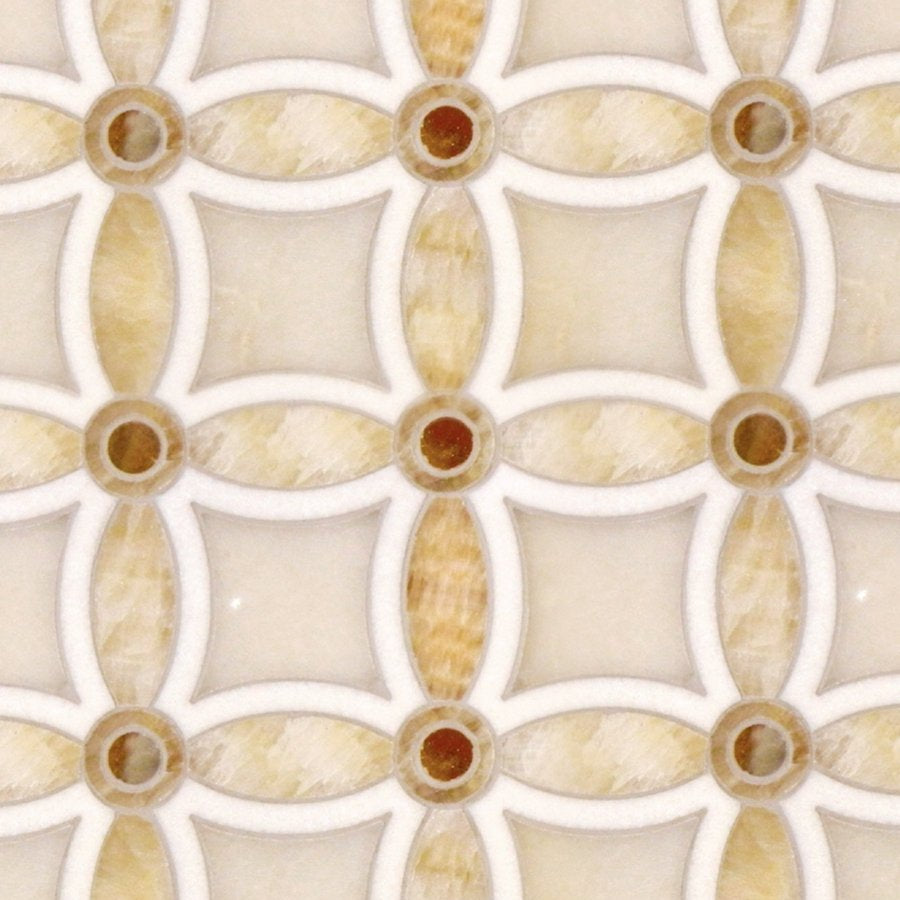 The circle tile elevates any room with elegance and style. The Curv Adimas Honey Circles Stone Waterjet Mosaic features a refined circle design that impresses immediately. Moreover, this piece is made from onyx tile, which adds a luxurious feel while showcasing a stunning stone circle pattern. Consequently, the intricate design of the mosaic creates a striking circle mosaic tile that turns a wall or floor into a work of art. It uses the natural beauty of dark honey onyx to highlight every detail of the circle design.