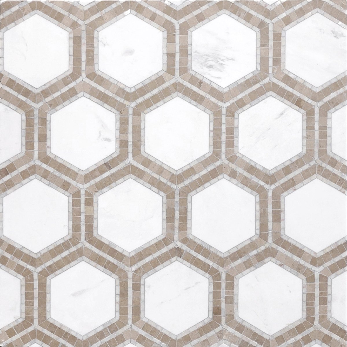 The Curv Primavera Hexagon Stone Waterjet Mosaic draws inspiration from the evocative shapes of nature, crafted with evocative honeycomb patterns for a piece that is as timeless as it is exquisite. This luxurious stone mosaic captures the lush beauty of the natural world with its intricate, geometric textures that add an extra touch of sophistication and grandeur to any space.