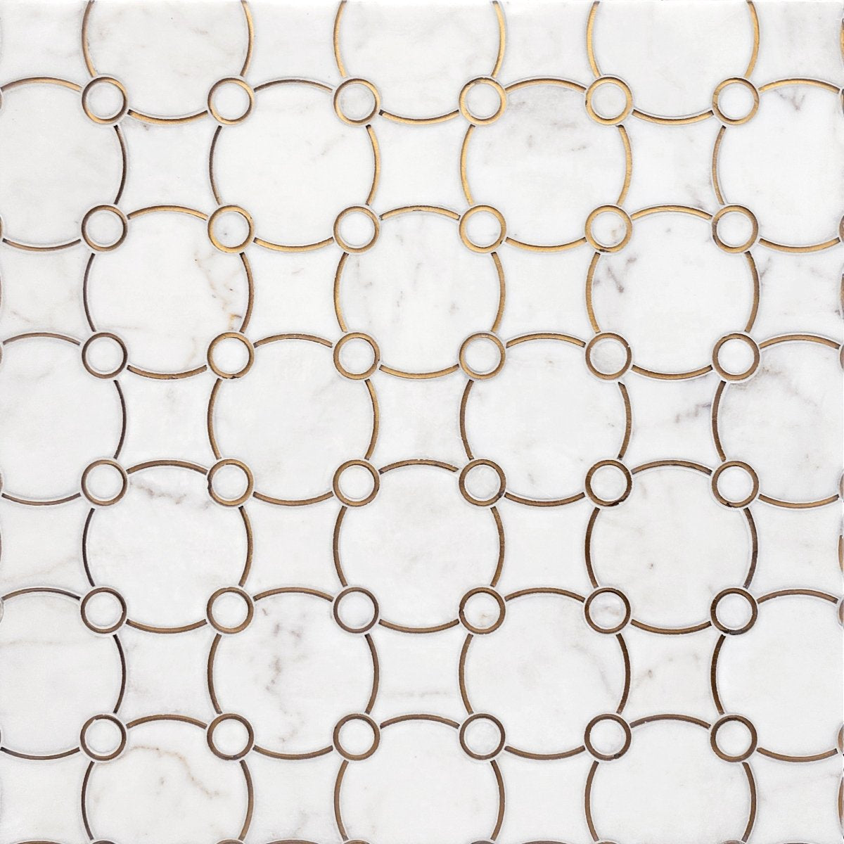 Introducing the luxurious Curv Artcircles Circles Stone and Glass Waterjet Mosaic, a unique mosaic crafted from a seamless blend of natural stone and gold leaf glass. Its mesmerizing interplay of colors was designed to refract and enhance the light, elevating your space to a whole new level of sophistication and elegance.
