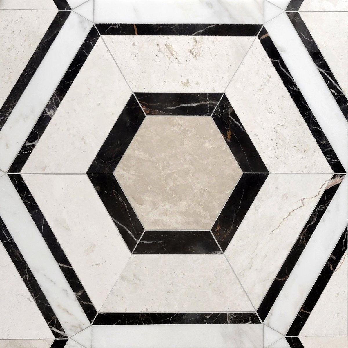 Transform your space into a timeless masterpiece with Decoline's Majectic Hexagon Stone Waterjet Mosaic. Crafted with intricately cut pieces, this luxurious mosaic captures the beauty of traditional artistry with its intricate hexagon pattern, perfect for a classically contemporary ambiance. Invite an air of sophistication into your home with this exquisite stone waterjet mosaic.