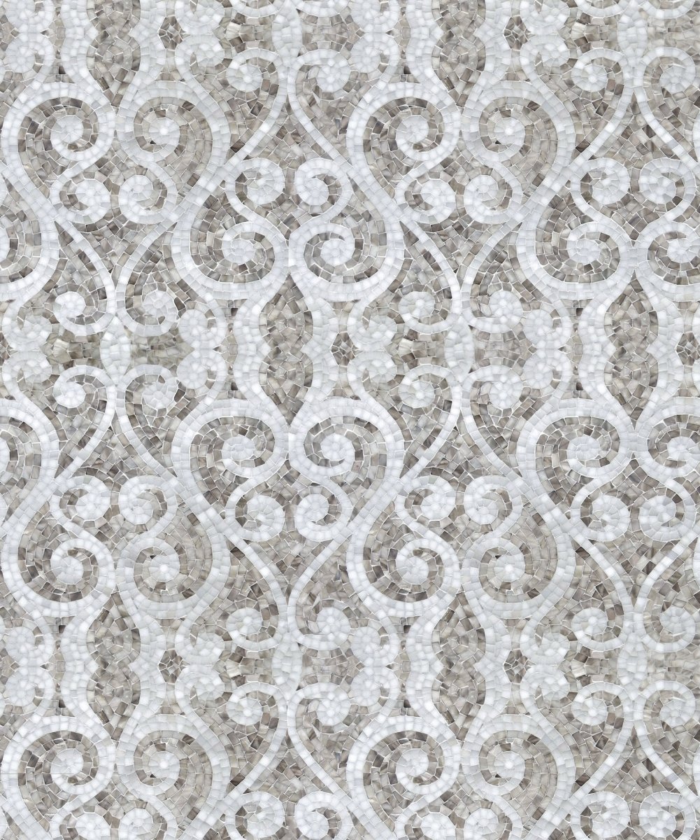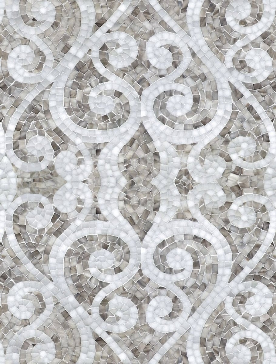 La Perla Suli Scroll Pearl Shell & Stone Waterjet Mosaic add sparkle and color to any space with their shimmering, stylish design. Crafted of unique natural shells and marble, these mosaic will give your kitchen, bathroom or living area a luxurious feel.