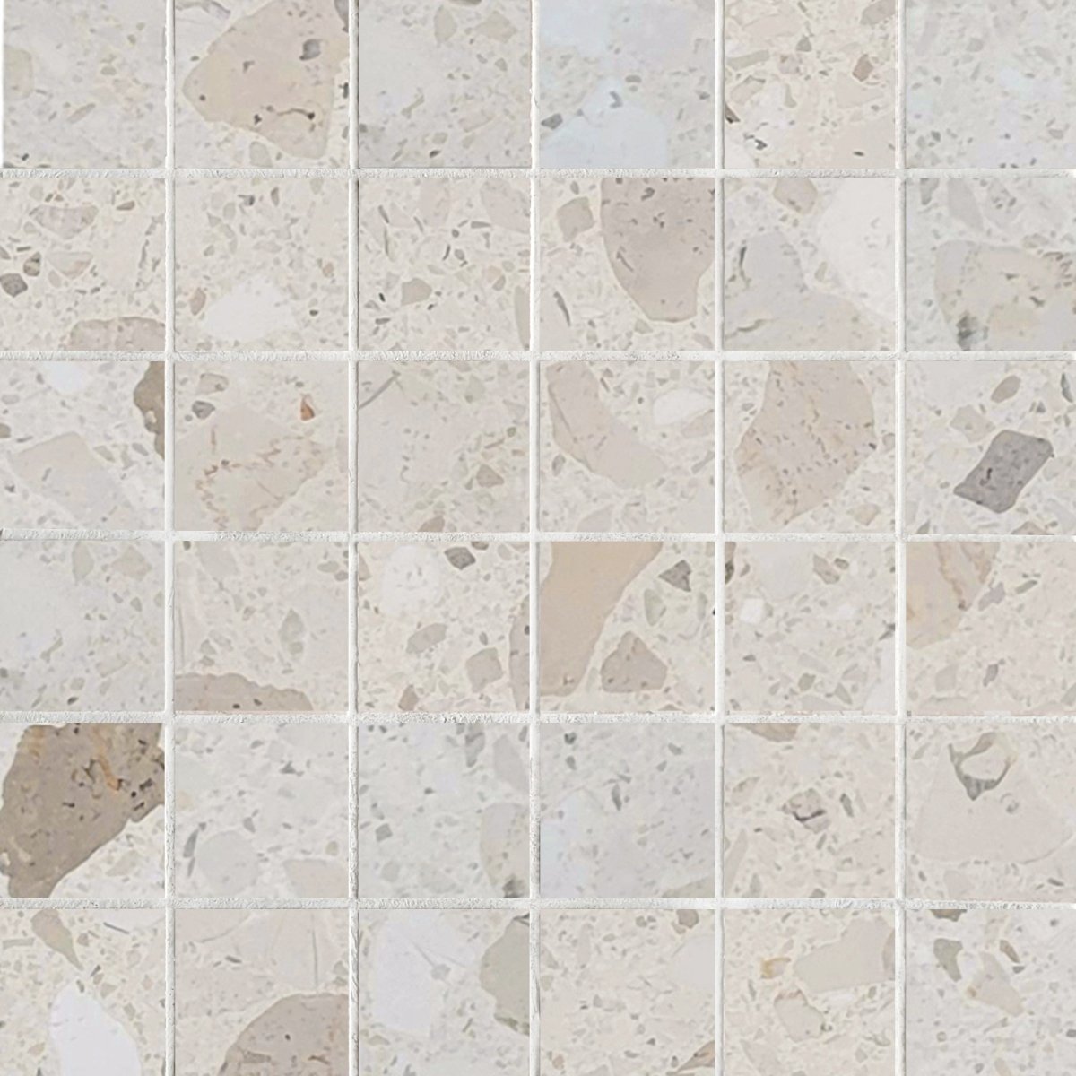 Elevate your interior spaces with the refined elegance of Sabbia Marble Terrazzo. These honed 2"x2" stone mosaics showcase a sophisticated blend of marble fragments suspended in a polished matrix, creating subtle depth and visual interest. The straight-edge format ensures seamless installation, while the honed finish delivers a soft, understated luster that complements both contemporary and classic design schemes. Perfect for accent walls, bathroom features, or kitchen backsplashes, these premium stone tiles bring timeless craftsmanship and understated luxury to any room.