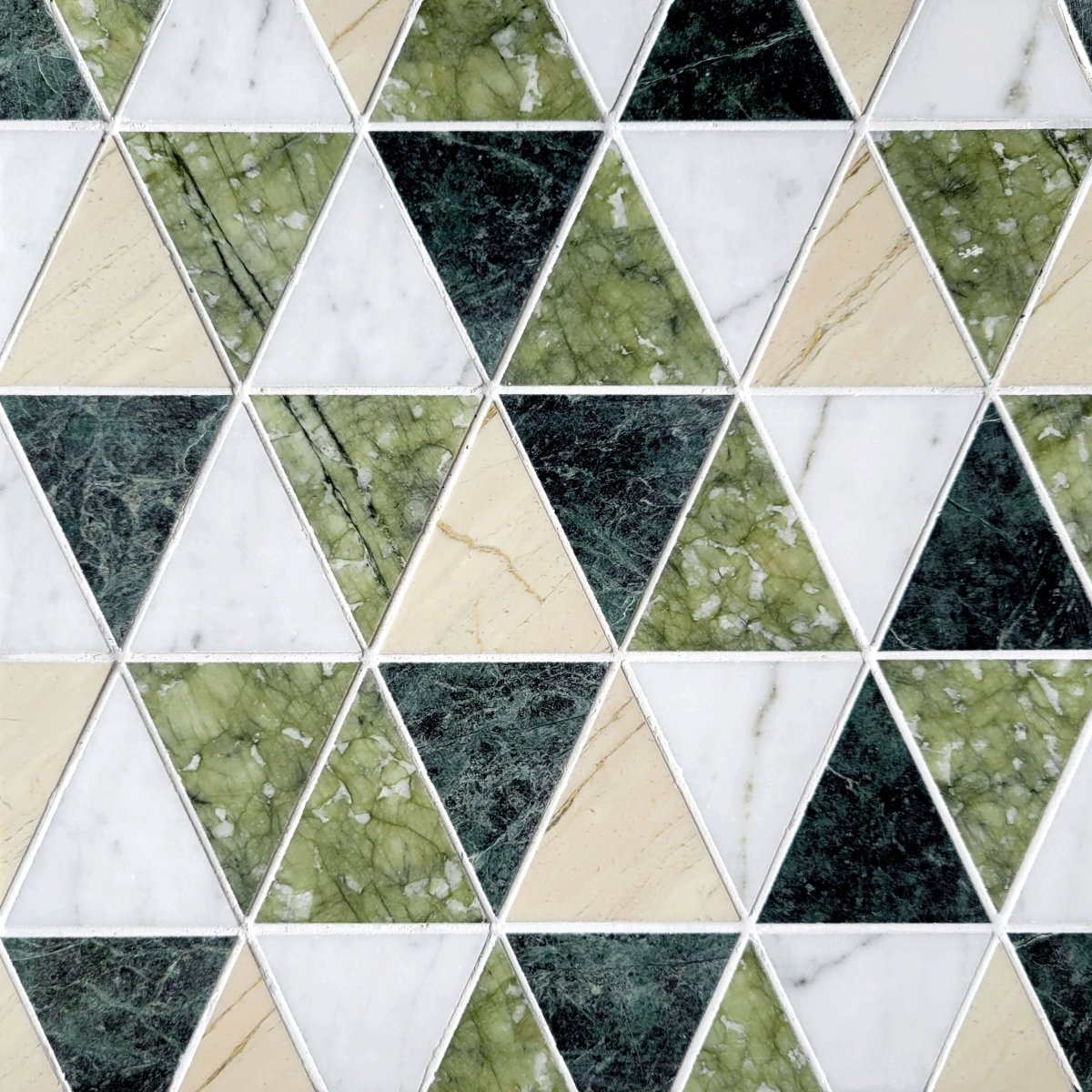Experience the luxury of our Triangle Everest Blend Stone Mosaic, fashioned from the finest stones. Its intricate triangle pattern adds intricate sophistication to any home decor, embodying a timeless elegance with its natural beauty. Perfect for modern or contemporary spaces, this premium mosaic will add a timeless touch of sophistication.