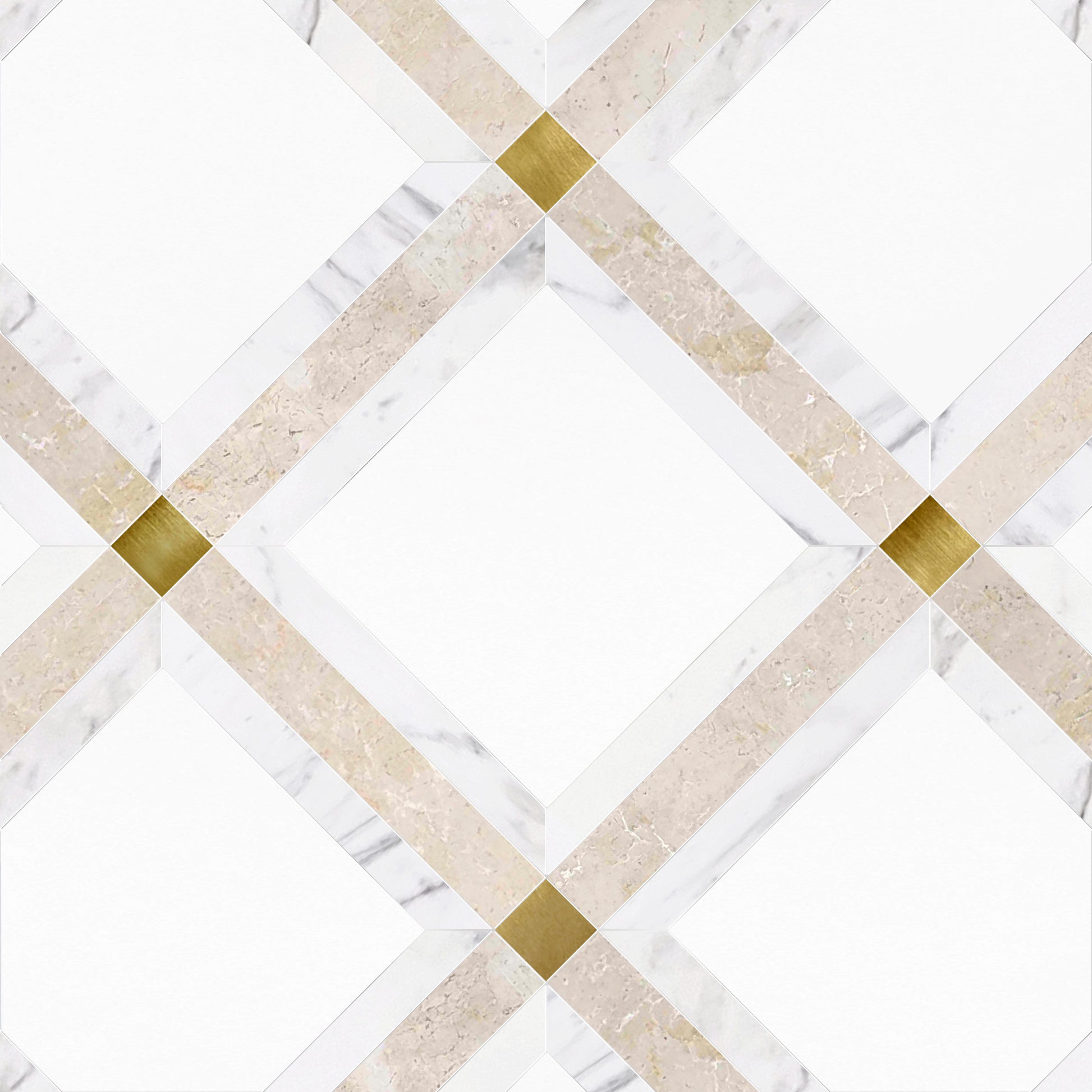 Elevate your space with the Umbria Spectre Geometric Marble & Brass Waterjet Mosaic Tile. This exquisite tile combines the timeless elegance of marble with the refined shimmer of brass, crafted through precise waterjet cutting to create a striking geometric pattern. Ideal for adding a sophisticated touch to walls or floors, it brings both artistry and durability to your interiors. Perfect for those seeking a unique blend of classic materials and modern design.