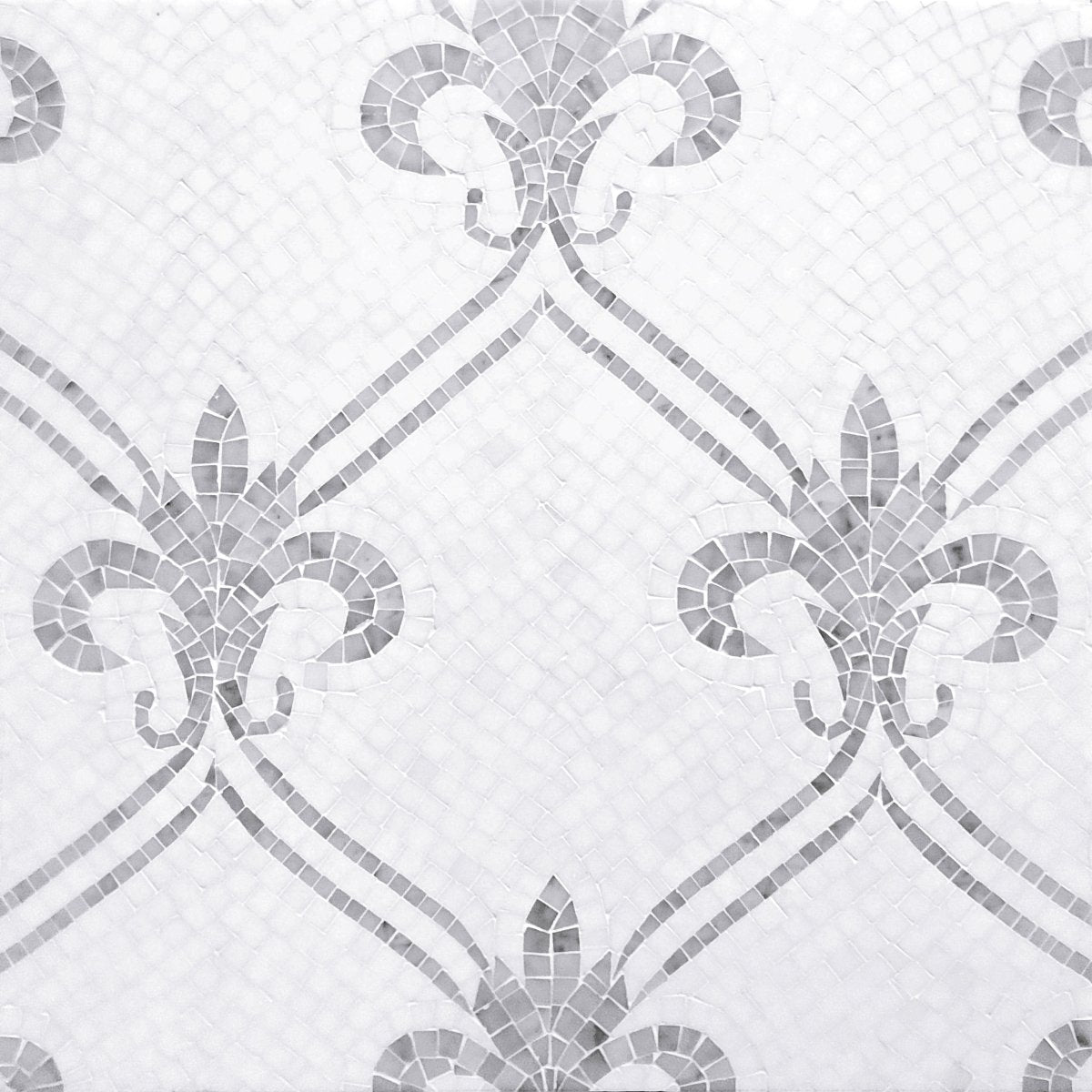 Our Hazel Fleur de Lis Stone Mosaic features a beautiful Fleur de Lis design in white and grey natural stone colors, perfect for adding an elegant accent to any space. The classic design is timeless and will add a sophisticated touch to any room.